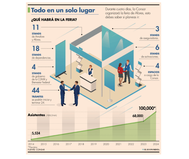 Según la Consar, la feria de Afores estará distribuida en un espacio de 4,000 metros cuadrados, dónde habrá módulos de atención de las 10 administradoras de fondos para el retiro y de más de 20 instituciones. Con esto se garantizará a los asistentes la posibilidad de realizar varios trámites el mismo día y en el mismo lugar.