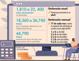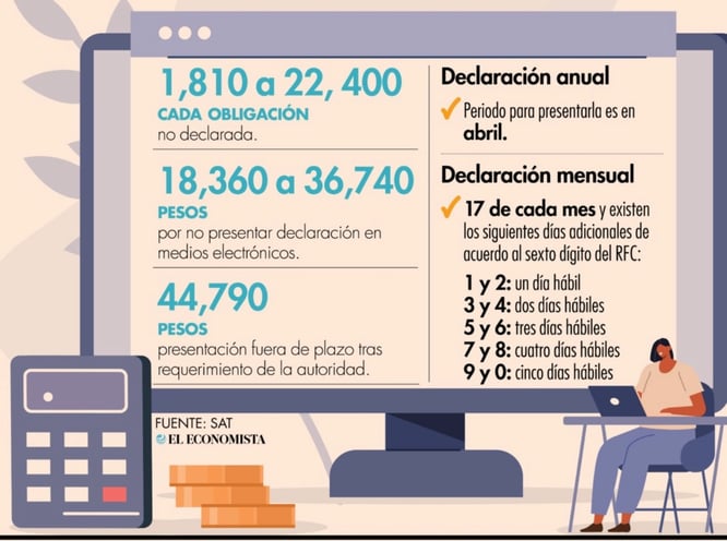 Virginia Ríos es contadora pública e integrante de la comisión de investigación fiscal del Colegio de Contadores Públicos de México y advierte que en caso de no presentar declaraciones, ya sea anual o provisional, la multa es de entre 1,810 a 22,400 pesos por cada obligación no declarada.